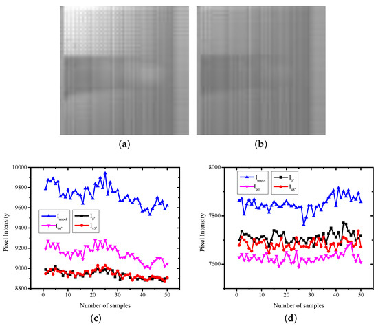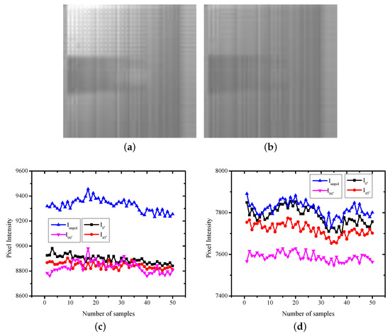 Sample images captured and the intensity variation of pixels with varying transmission axes over time in a resting state, with the incident light being (a,c) unpolarized or (b,d) linearly polarized at 45.
