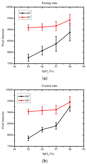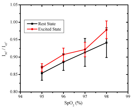 Figure 8 shows the variation of the ratio of / for varying SpO levels. The ratio / measures the degree of polarization. The ratio was computed after the individual pixel information was normalized with the intensity information received by the pixel without any wire grid polarizer. The normalization allowed discarding the variations in the measured intensities for individual characteristics such as the color of the skin or other measurement variations, such as background light. A monotonically increasing behavior was observed in the ratio / for both the resting and excited states. The excited state showed higher variations compared with the resting state. The higher variations were due to increased levels of HbO and heart rate. Thus, a higher / ratio corresponded to increased SpO levels and increased heart rate. The measured heart rate and SpO using the commercial oximeter are also shown in Table 1. The increase in the variations in the received pixel intensities for the excited state directly corresponded to the increase in the heart rate to maintain the SpO levels.
