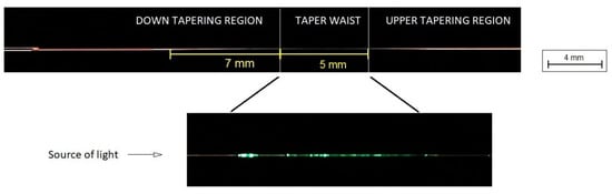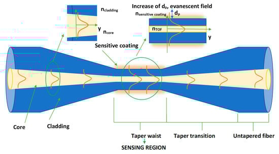 Nanomaterials have revolutionized the world of researchers. By combining nanoparticles (NPs) with various materials, it was possible to improve many material properties, which in turn increased the effectiveness of many devices, sensors, and improved parameters in various areas, including medicine [1,2], conversion energy [3,4], industry [5] and sensors [6], etc. Fiber optic technology also uses nanomaterials as a material doped to the fiber [7], or as a part of an extra layer on the fiber [8,9]. For different geometrical structures of optical fibers, scientists use many nanoparticles coatings and films [10,11]. The combination of these two technologies allowed the development of the non-telecommunications part—the construction of gas sensors [12] and the detection of other parameters such as pH [13], temperature [14,15], humidity [16], etc. They also allowed us to improve sensor parameters: switching time of liquid crystal cells [17], sensitivity [18], dynamic range [19], etc. By adding nanoparticles, it is also possible to enhance the non-linear and fluorescent effects [20]. One of the frequently used fiber optic structures for connecting with nanomaterials for non-telecommunication applications is tapered optical fiber technology (TOF) [21]. Thanks to TOF, we can expose the evanescing field to the outer sensitive coating that surrounds the TOF area. It is directly related to the change in the standard optical fiber geometrical parameters during the tapering technological process [9,22]. As the optical fiber is pulled out, the diameter of the fiber is reduced, and thus the part of the evanescent field emerging in different regions of TOF changes simultaneously. The most sensitive area in a taper is the waist—this is where the evanescent field is the largest, see Figure 1. In this way, the smallest changes in the refractive index (RI) parameter of the environment (sensitive coating) are detected by TOF (Figure 1).