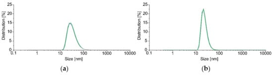 Size (diameter) distribution of Fe3O4NPs redispersed in chloroform (20 °C) (a) by volume (b) by number. Measurements were conducted in three repetitions (visible as green, blue, and gray lines). The average sizes for the average measurement were 34.32 nm with a standard deviation of 17.79 nm by volume and 23.49 nm with a standard deviation of 7.66 nm by number.