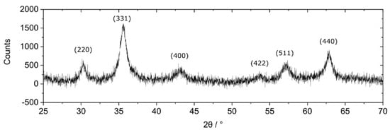 The diffractogram reveals the structure typical for Fe3O4 [34,35]. The size of the crystals calculated according to the Scherrer equation [36] is 7.00 ± 1.42 nm. The difference between PXRD size and DLS measurements was observed because DLS measures the hydrodynamic radius of the nanoparticles in the suspension, whereas PXRD receives information about the size of single crystallites. For polydispersed samples, the broadening of the peaks in PXRD measurements highly depends on the fraction of the smaller crystallites, whereas in DLS, the measurement may be biased by the presence of the fraction of bigger objects, which scatter light intensively.