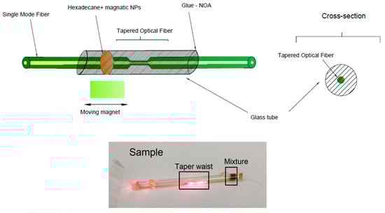Materials engineering and fiber optic technology allow many combinations of different materials, which gives further interesting results and sensor application possibilities. The research presented in the article is an extension of the previously performed TOF tests and additional material. Research on this type of combination began with TOF and pure alkanes [24]. Due to the use of the properties of phase transitions of liquid–solid alkanes, which is directly related to the step change in the refractive index of the given alkane surrounding the taper, it was shown that the losses in the structure and ON–OFF transmissions were related to the change of temperature. This research showed the possibility of using this connection of materials as a temperature sensor. During the investigation, due to the low thermal conductivity of alkanes, a temperature hysteresis between the heating and cooling processes was observed. Hence, in a next stage of the research, ZnS: Mn nanoparticles of various concentrations were added to the alkanes [25,26]. Doping with NPs allowed for a change in temperature hysteresis and the possibility of a faster change from the ON–OFF state, and vice versa. NPs constituted additional centers of crystallization and additionally influenced the improvement of alkane parameters by increasing thermal conductivity. The research in this article focused on expanding the study and combining hexadecane (higher alkane C16) with magnetic Fe3O4 NPs nanoparticles. Thanks to such doping, we can control the position of the liquid with the help of a magnet, and, thus, influence the polarization parameters, which is related to the possible use of such a structure as an optical power sensor or a polarization parameter switcher. This article shows a new possibility to control parameters of light propagated in TOF, by changing the location of a new magnetic mixture (C16 + Fe3O4 NPs). The basic difference between the last and new research is changing the type of NPs, we used the magnetic properties of NPs which affect alkanes, without measuring thermal properties of the mixture as in [24,25,26]. In this article, we show the possibility of dynamically changing the polarization properties at room temperature. Parameter fluctuations are caused by a change in the location of the mixture between areas of the TOF, which causes a temporary change in the RI of the environment, whereas in the previous research, only a temperature change could influence transmission variations and polarization parameters. In the paper, the appropriate concentration of NPs in C16 was selected, a method of securing the TOF was developed, and technological parameters were selected for the production of TOF (such as elongation, consequently TOF diameter, losses) to obtain the best final results when TOF is connected with an additional material.
