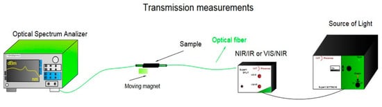 The transmission measurement system used consisted of: a broadband light source NKT Photonics, SuperK Extreme EXR-15, Birkerod, Denmark (operating in the 400–2400 nm range), a splitter connected to the NKT PhotonicsSuperK SPLIT laser range NIR/IR and VIS/NIR, optical spectral YOKOGAWA analyzer model AQ6373, Tokyo, Japan (operating in the range of 350–1200 nm) and AQ6375, Tokyo, Japan (operating in the range of 1200–2400 nm) (Figure 8).