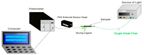 Polarization measurements were carried out by using two configurations of the set-up presented in Figure 9. The first configuration consists of the light source (TSL-210V, Santec, Aichi, Japan) deterministic polarization controller (DPC 5500, Thorlabs, Newton, NJ, USA), sample, and polarimeter as two parts, i.e., head (PAN5710IR3, Thorlabs, Newton, NJ, USA) and electronic unit. Both DPC and polarimeter electronic units were integrated into the same chassis (TXP 5005, Thorlabs, Newton, NJ, USA). This set-up allows to measure with a polarimeter changes generated by the DPC Stokes vectors. Acquired data were used to calculate Mueller matrices of the tested sample. Using the Lu-Chipman decomposition method [38], it is possible to extract from the Mueller matrix all optical parameters of the sample, i.e., losses, depolarization, dichroism, and birefringence [37,38]. In the simplified version of this set-up, when DPC was excluded from the set-up, only the Stokes vector changes were measured. In this measurement, two different wavelengths of light sources, i.e., 850 nm (LDPC-850, Optics, Ottawa, Canada), and 1550 nm (TSL-210 Santec, Aichi, Japan) with appropriate polarimeter heads, i.e., PAN5710IR2, and PAN5710IR3 (Thorlabs, Newton, NJ, USA) were applied. Data were acquired and processed by PC.