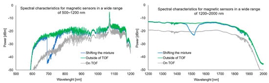 Spectral characteristics for magnetic sensors in a wide range of 500–1200 nm and 200–1200 nm with a mixture outside the taper region (green line), on the taper region (grey line), and visualization of the sliding mixture along the taper (blue line).