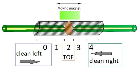 Measurement scheme for determining the effect of the magnetic mixture on the TOF properties. Measurements were started from position “0” and the magnet was moved to position “4” from the left of TOF to the right and backward with the measure in the same position. At each of these points, the Mueller matrix was calculated.