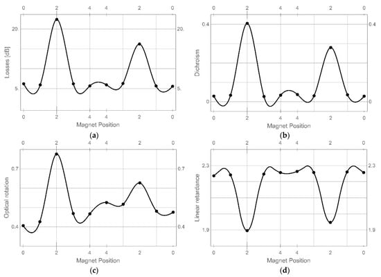 Calculated Mueller matrices consist of full information about the optical properties of the tested sample. By using the standard Lu-Chipman decomposition method, five main optical parameters, i.e., losses, depolarization, dichroism, optical rotation, and linear retardance were calculated [39,40]. Depolarization changes were not observed for this optical element, however, four remained parameters experienced significant changes. These parameters were shown in Figure 12. Vertical axes of all plots in these plots indicate magnet position correlated with Figure 11. The points of these plots are measured points, whereas the solid lines are interpolations between these points.