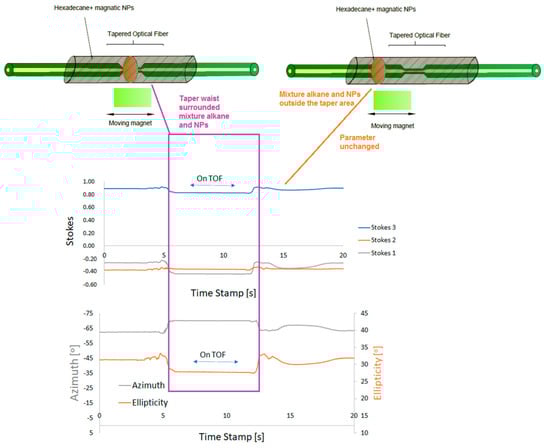 During the dynamic measurements, the time when the mixture is in the taper waist area was changed, causing changes in the polarization parameters. The magnets were moved along the taper at a constant speed, setting the mixture on the taper waist for a period of 5 s, 10 s, or rapid sweep causes a temporary change. Transmission changes and losses may be caused by the fact that some NPs may be deposited on the taper during the liquid sweep and temporary changes of RI.