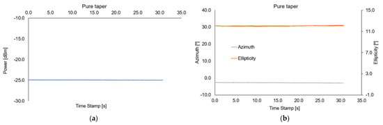 Reference graphs of (a) optical power, (b) azimuth and ellipticity parameters for the tapered optical fiber taper.