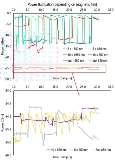 As it can be noticed for both wavelengths, the movement of higher alkanes doped with magnetic NPs causes a decrease in power. For all measurement cases, fast movement of the mixture, 5 s and 10 s position of the mixture on a taper waist region are observed which results in a power decrease. For a wavelength of 850 nm, the dynamics of changes are from 0.2 dBm to1.0 dBm. Additionally, for the shorter effect of the magnetic mixture effect, the power shapes are irregular. Such small changes are linked with a low impact of evanescence wave with an external magnetic mixture which confirms the theory of deep penetration of a leaking wave for this wave and single-mode fiber for the telecommunication range. For a wavelength of 1550 nm for all cases, the dynamics of change are much higher than for 850 nm and oscillate around 15 dBm and the shapes are stabilized for an extended period. These results prove the proper match of taper parameters which allowed the magnetic mixture to interact with the evanescence wave. In all graphs, a significant disturbance of power (peaks) can be observed. There are related to a displacement of the magnetic mixture through the transition area, as well as a sudden change of RIs for the taper waist area. This effect will be investigated in future measurements.