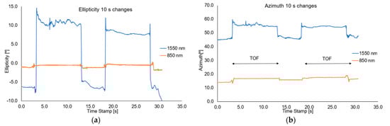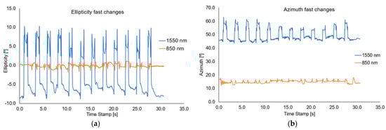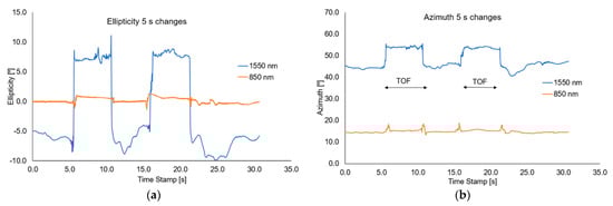 For this measurement setup, the change of azimuth and ellipticity was investigated. Figure 16, Figure 17 and Figure 18, show the graphs describing the changes in the above-mentioned parameters (optical power, azimuth, and ellipticity) for a rapid change in the RI of the external environment of TOF caused shifting of a mixture under the influence of the magnetic field for a different time—5 s and 10 s for wavelengths of 850 nm and 1550 nm, respectively.