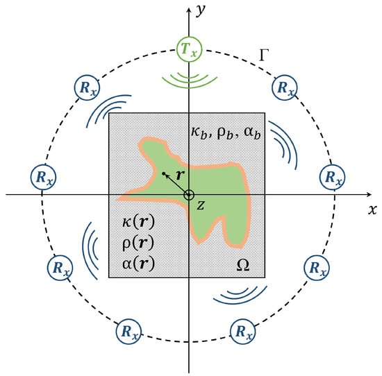 For the sake of simplicity, a two-dimensional (2D) scenario will be considered in the following section, as shown in Figure 1. Under this hypothesis, the integral equation governing the scattered field is a function of the compressibility, attenuation and density of the objects under investigation and of the background medium in which the signal is propagating.