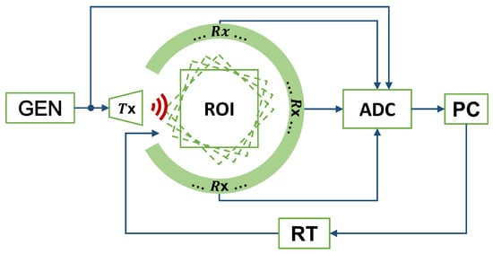 Block diagram of the ultrasound tomography system. The transmitter (Tx) is piloted by a waveform generator (GEN). The US waves impinge the region of interest (ROI) and the scattered waves are sensed by the receivers (Rx). Both transmitted and received waves are digitised by an analog-to-digital converter (ADC). This process is repeated for every angular position of the ROI, and the rotation is carried out via a rotating table (RT). The entire measurement process is managed by a personal computer (PC).