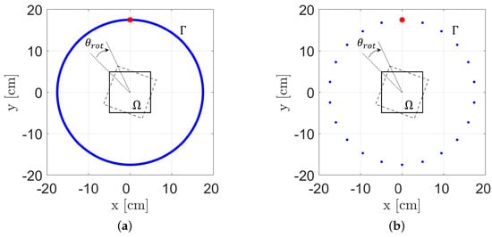 It is easy to observe that both the object’s location and dimension are perfectly retrieved in Figure 5d, and this is also due to the higher amount of collected data (i.e., 308 receivers and 308 view angles; the measurement configuration is shown in Figure 4a). Conversely, the recovery performance slightly worsens in the case reported in Figure 5g since fewer data (i.e., 21 receivers and 308 view angles) were used due to the adopted measurement configuration (Figure 4b). It is worth noting that this data reduction process generates a “ring” effect visible in the retrieved image. Lastly, Figure 5j illustrates the support estimation obtained via Equation (8) in the case of experimental data processing (measurement configuration of Figure 4b). It is easy to observe that despite the unavoidable presence of noise, it is still possible to retrieve the correct target location and dimension.