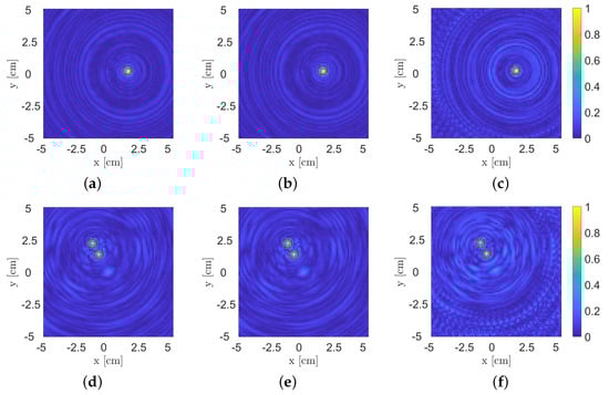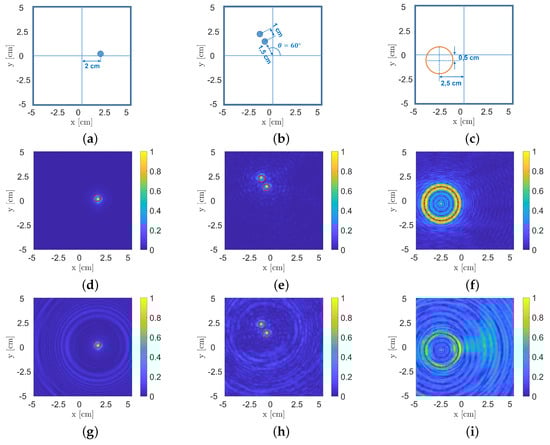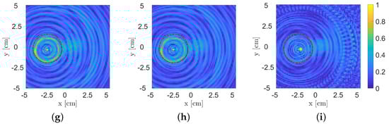 The first scenario (Figure 5a) involves a single metallic cylinder with a 4 mm diameter placed at a 2 cm distance far from the ROI’s centre (with respect to the centre of the target). For a 10 × 10 cm2 imaging region, the qualitative reconstructions of this first example by exploiting Equation (8) are shown in Figure 5d,g,j, with the reference target position and extension defined by the red dash-dot line. More specifically, Figure 5d,g show the results of the corresponding numerical inversions obtained by processing the simulated numerical data collected with different measurement configurations, i.e., the ones shown in Figure 4. Finally, Figure 5j illustrates the processing of the experimental data, for which its collection was carried out via adopting the measurement configuration reported in Figure 4b.