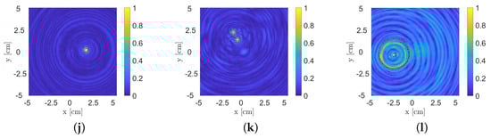 The last case considered herein is related to a hollow cardboard cylinder with a 3 cm diameter and 1.5 mm thickness. In this case, the centre of the object was placed at approximately 2.5 cm from the centre of the ROI, as shown in Figure 5c. This testbed is particularly interesting since it deals with a larger, hollow object that is particularly challenging by adopting a linear approximation for the target support estimation due to the highly nonlinear interactions related to multiple scattering phenomena. As a matter of fact, the adopted measurement configuration has a stronger impact in this case rather than for the small metallic cylinders, as proved by the results reported in Figure 5f,i, and the former shows improved results due to the higher amount of data used to perform processing. Finally, Figure 5l reports the recovery obtained by processing experimental data. As mentioned before and, conversely, from the small-metallic-cylinders case, here, the target is substantially larger with respect to the wavelength, and a linear model is assumed (Equation (5)), which justifies the presence of the ring effect in the image, as also confirmed by the recovery in Figure 5i, which also is affected by the same artifact.