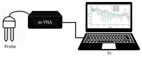 An EM stimulus propagates along the probe and is partially reflected at the probe-material interface due to permittivity variations. The dielectric characteristics of MUT can be retrieved by analyzing the reflected signal. The reflected stimulus can be measured either in the time domain (time domain reflectometry—TDR) or in the frequency domain (frequency domain reflectometry—FDR). Generally, instruments operating directly in FD, such as VNAs, have the advantage of higher measurement accuracy [42] as calibration procedures can be implemented to minimize systematic errors. However, benchtop VNAs are more expensive than instruments operating directly in the time domain (TD). Recently, low-cost portable VNAs have been made commercially available and they are suitable for measurements over a small range of frequencies (up to 3 GHz). In this paper, reflection measurements in the frequency domain are performed using a miniaturized low-cost VNA, and the reflected signal is then analyzed in terms of the frequency-dependent reflection scattering parameter S11(f).