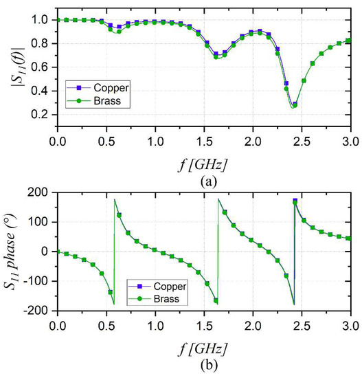 In this work, a customized bifilar probe with a rod length of 100 mm made of brass has been adopted. Brass has good corrosion resistance, and it is typically less expensive than other materials such as copper or bronze. It is a strong and durable metal, which prevents the deformation of bars when immersed in granular soil. For the sake of completeness, a CST simulation comparing the conductive performance of the probe in air with the rods made of brass and copper was carried out. As a result, from Figure 2, it can be noted that S11 magnitude and phase curves are almost superimposed, demonstrating that small variations between the two materials, especially in terms of electrical conductivity, do not significantly affect the frequency behavior of the probe.