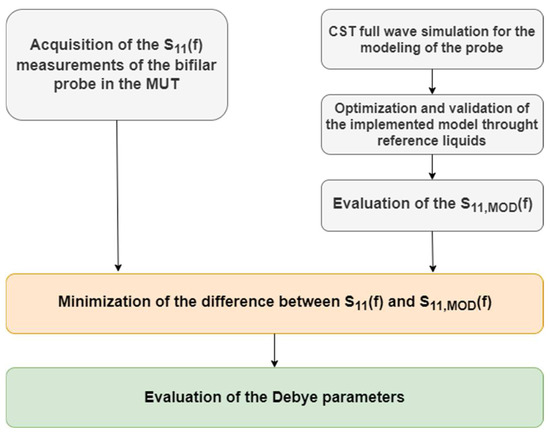 In this work, a methodological procedure has been adopted to accurately retrieve the Debye parameters of soil. This consisted of three main steps: accurate modelling of the two rods; validation of the model using reference liquids; and final testing on soil samples. The subsequent main steps of the procedure are schematized in Figure 5 and can be summarized as follows: