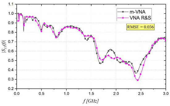 To test the performance of the m-VNA, first a preliminary comparative analysis with a reference benchtop, an accurate but expensive VNA, namely the VNA R&S ZLV6, was conducted. The two rods were left in the air and the S11 as a function of frequency was measured using both VNAs. The measured data is presented in Figure 6, and the root mean square error (RMSE) was 0.036.