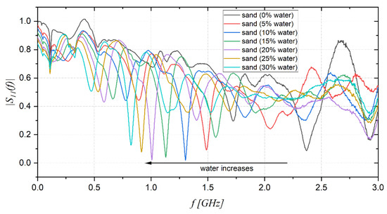 The measured S11 as a function of frequency for sand with different percentages of water are presented in Figure 7, illustrating that when hydration increases, the resonant peaks of |S11(f)| shift toward lower frequencies.