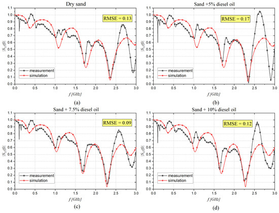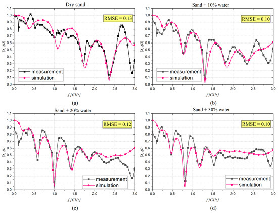 In order to retrieve the dielectric characteristics through the CST software, the minimization step and a set of ‘‘initial guesses” for the Debye parameters of dry sand were considered ( = 2.52, = 2.47, and = 21.5 ps [48]). The best agreement between measured data and simulations for dry sand and dry sand with different moisture content (10%, 20%, and 30%) are reported in Figure 8a–d.