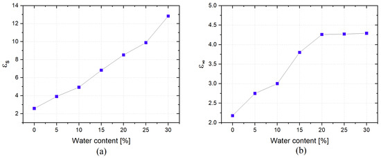These results indicated that and were the parameters that exhibited significant variations for different MUT. In particular, they increase monotonically when increasing the moisture percentage, as can be seen in Figure 9a,b for and , respectively. This is attributed to the fact that water has a high dielectric constant ( ≈ 80), so it modifies the dielectric parameters of the MUT by strongly affecting the propagation of electromagnetic waves, resulting in a significant increase in both and .
