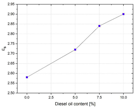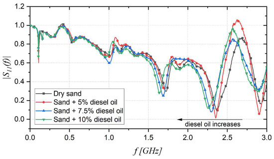 The same kind of minimization procedure implemented for the sand progressively filled with water was carried out for sand contaminated with diesel oil at different percentages, starting from dry sand and then adding 5%, 7.5%, and 10% diesel oil. Figure 10 shows the |S11(f)| of the different samples, and it can be noted that as the diesel oil concentration increases, there is a shift of the resonant frequency towards lower values.
