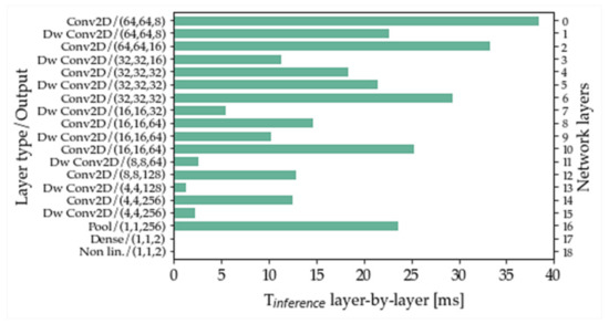 We analyzed and investigated parameter behavior layer by layer. This was helpful to understand on which layers RAM and ROM memories reside and where MAC operations are carried out in greater numbers, but especially to denote the best trade-off time inference layers bottlenecks. Figure 1 illustrates this latter aspect: the horizontals bars represent the layers times inference on board from the first C net layer (with “0” index) to the last nineteenth (with “18” index), compiled from up to down on the right y-axis. The left y-axis specifies the type and output dimensions of each net layer: the first layer type is a 2D standard convolution with (64 × 64 × 8) filters, while the last layer type is non-linearity and its output is a double neuron as binary classification expects.