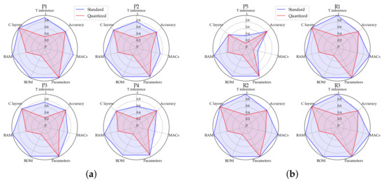 Optimization tests over best trade-off. P(i) means Pruning test while R(i) means Regularization tests, both executed on Keras (on blue) and quantized TensorFlow lite (on red) versions. (a) P1–P4 tests. (b) P5, R1–R3 tests.