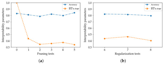 Figure 3a,b show accuracies and intersections over unions for each test, for pruning and regularization, respectively. These graphs indicate two events: firstly, the trends of accuracy and IoU are largely similar to each other. Exceptions are steps P3 to P5, where trends are opposites. On all tests small variations are outlined, being able to observe substantial stability of both performance and interpretability factors. Table 5 reports these aspects for each execution. The low variances of these parameters between the eight tests mean not only having a certain safety margin in correct classification, but even LIME criteria remain the same for most of the test set images explainers. Finally, another aspect is represented by the low average value of IoU over the eight tests, equal to 0.394. Investigating a typical human detection problem through a classification task may involve not so high IoU values: LIME superpixels, differently by detection boxes, cannot isolate people one by one but act, including the densest areas of the image, without geometrical restrictive rules. This implies that the size that the superpixels union area of the two classifiers can reach over is large. Consequently, there are low values of IoU.