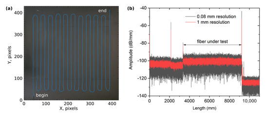 A flat aluminum sheet with a thickness of 1 mm and a size of 250 × 250 mm was used as the base of the sensor panel. To reduce the effects of bending deformations during heating, the panel was fixed to a rigid frame, which, in turn, was pressed against a massive laboratory table. Fibercore SM1500(5.3/80)P fiber was arranged in a serpentine pattern with 10 mm spacing in the central area of the panel, thus filling an area of 200 × 200 mm (Figure 2a). The fiber was fixed to the surface of the panel by cyanoacrylate glue, which was thinly applied to the laid fiber. After the glue dried, a black matte paint was applied to the panel to reduce the effect of glare when measuring temperature with an IR thermal imager. The final assembly was heated at about 80 °C for 2 h to accelerate drying and relieve residual stress associated with the presence of glue and paint. Figure 2b shows the reflectogram of the FUT measured with a LUNA OBR 4600 after assembly of the panel.