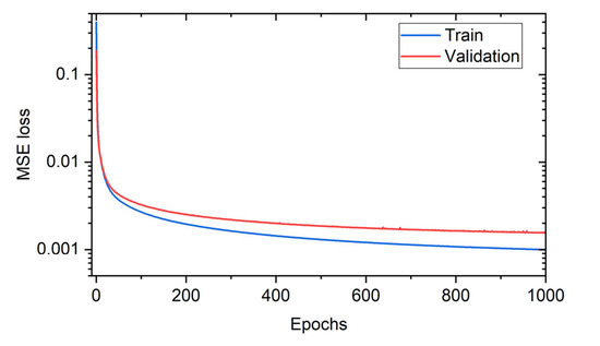 Next, we examine the performance of a neural network. The validation dataset (25% of training data) allowed us to tune the network hyperparameters (e.g., topology, size, optimizers, etc.) and to track the model overfitting. The chosen network architecture (FFNN) consists of input, one hidden and output layers, as shown in Figure 1b. All data processing was conducted using the TensorFlow framework in combination with Keras and scikit-learn [37] Python programming libraries. Input layer had 550 neurons corresponding to the size of a distributed spectral shift provided by the OBR. Hidden layer has 2000 neurons with ReLu activation function. These parameters were obtained by a routine hyperparameter optimization procedure with the assistance of the Optuna framework [38]. The output layer has 625 neurons corresponding to the size of a compressed 25 × 25 pixel thermal image. We used RMSprop optimizer for adjusting the weights of the neurons with an initial learning rate of 10−5 and mean square error (MSE = RMSE2) as loss function. The network was trained during 1000 epochs on the mini-batches with a size of 32. Standardization of the input and the output data was applied by subtracting the mean value and dividing by the standard deviation of the dataset. Learning curve (Figure 7) represents the evolution of the loss function for training and validation datasets (25% of the training dataset) over epochs. It confirms the absence of overfitting the FFNN and the stability of the found architecture.
