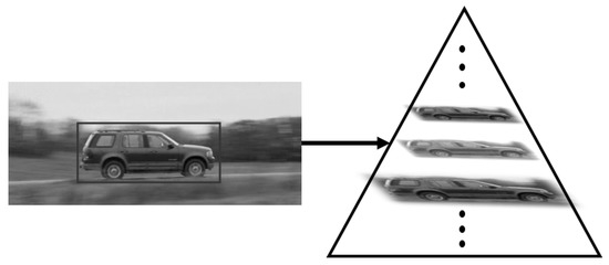 where C ( x , y ) represents the correlation filtering results of x and y and T represents the tracking template. Since the correlation filter requires the same-sized input images, the scaled target images in the multi-scale pyramid need to be restored to the image with the same size as the previous frame through the resize operation. Meanwhile, the size of the patch window in KCF should also be scaled according to the scale factor ε determined in Formula (6). The construction process of the scale pyramid is shown in Figure 2.