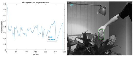 Figure 3. Left: the change in the maximum response value of the correlation filter; right: 255th frame of ‘coke’ sequence in OTB datasets.