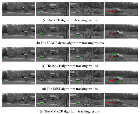 Figure 4. Tracking effect comparison of KCF, SRDCF-decon, BACF, DSST, and our MMKCF on the Car-scale, as shown in (ae), respectively. These frames are 10, 100, 150 and 220, respectively. The red dot represents the motion of the target center.