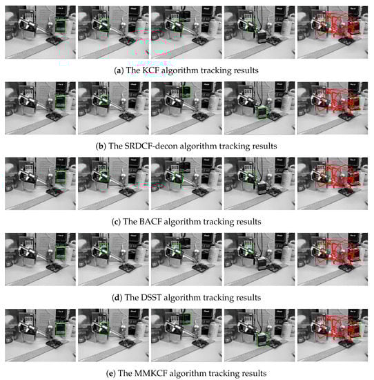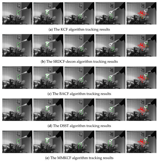Figure 6. Tracking effect comparison of KCF, SRDCF-decon, BACF, DSST, and our MMKCF on Box, as shown in (ae), respectively. These frames are 10, 460, 500, 800 and 900, respectively. Red dot represents the motion of the target center.