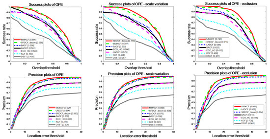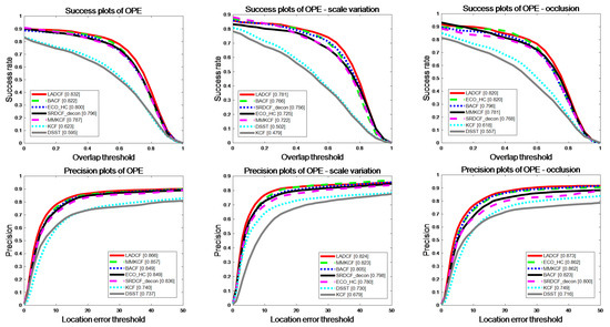 Figure 7. OPE comparison of our tracker and other 6 excellent trackers in terms of precision and success rate on the six selected video sequences.