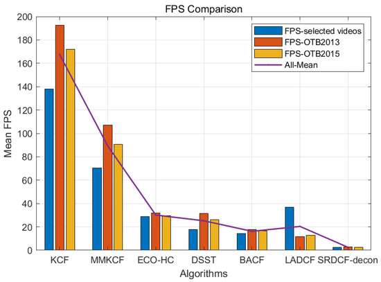 Figure 8. FPS comparison of our tracker and six other excellent trackers on the six selected video sequences, OTB2013 and OTB2015.