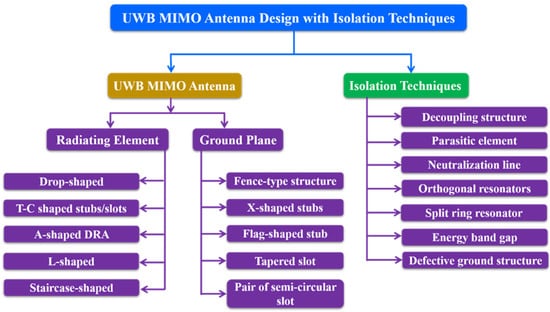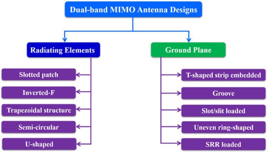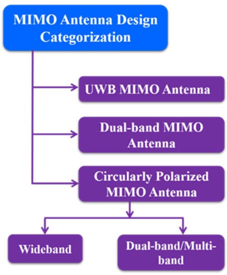 In this review paper, the MIMO designs are categorized based on the number of elements used and the type of characteristics demonstrated by the antenna. Most of the MIMO antennas available in the literature belong to UWB, dual band or circularly polarized types and are classified in Figure 1. The details of each type of MIMO design are further described in the following sections.