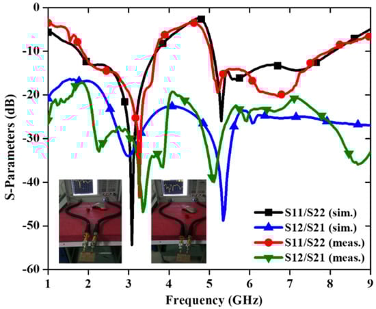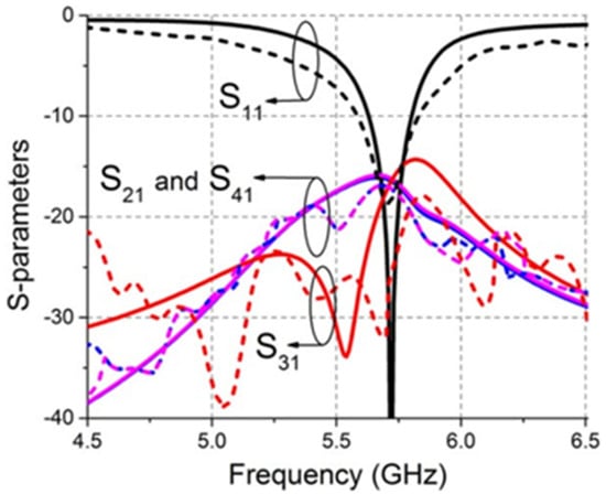 S–parameters of the MIMO antenna. — simulated and --- measured [21].