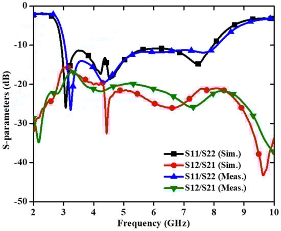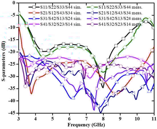 Figure 5 shows the structure of the 4 × 4 UWB MIMO antenna as reported in [22]. The dimensions of the reported antenna is 48 × 34 × 1.6 mm3. The MIMO design consists of the rectangular patch attached with a half-circular disc of radius 4.8 mm. The lower corners of the rectangular patch are carved with a small amount of copper to achieve UWB characteristics. The neutralization line connects the two symmetrical antennas to increase the isolation between the two radiating patches. The corresponding S-parameters are plotted and presented in Figure 6. The observed bandwidth and isolation of 2 × 2 and 4 × 4 MIMO antennas are 95.22% (3.51–9.89 GHz) and −24 dB, and 96.47% (3.52–10.08 GHz) and −23 dB, respectively.