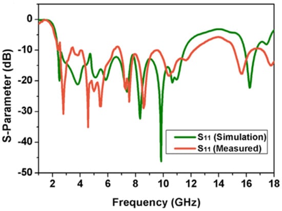 Diversity gain indicates the quality and reliability of a MIMO antenna in wireless systems. Hence, the DG of the MIMO antenna must be high (10 dB) within the acceptable frequency band. The DG is calculated using the ECC value and can be given by Equation (2) [4,11]: