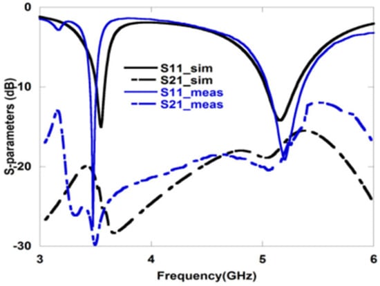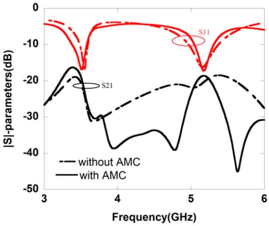 In [47], back-to-back C-type slot resonators are connected in a radiating patch of a CPW-fed dual-band MIMO antenna using an artificial magnetic conductor as shown in Figure 10. The antenna elements are separated by a gap of 8.3 mm, and the antenna resonates at 3.5 and 5.2 GHz (Figure 11 and Figure 12). Although, there is already a significant amount of isolation at the lower band, a U-shaped slot is introduced in the GP to further boost the isolation at the upper frequency band.