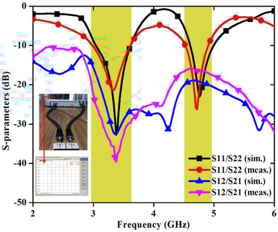 To obtain the dual-band characteristics, an arrow-shaped strip is placed between the U-shaped patch with two L-shaped slots on the GP. The dual frequency bands cover the frequency range from 2.99 to 3.61 GHz (lower band) and 4.53 to 4.92 GHz (higher band) with isolation ≤ −25 dB and ≤−16 dB, respectively (Figure 16). This MIMO antenna effectively covers the 5G and sub 6G n77/n78/n79 spectrum.