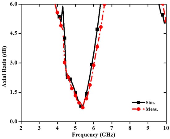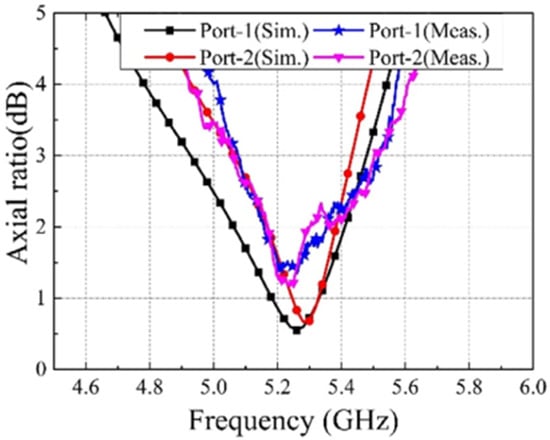 Figure 18 shows a small and compact two-port circularly polarized MIMO antenna with dimensions 24 × 24 × 1.6 mm3 [71]. The circularly polarized radiated field of the MIMO antenna is achieved using a unique ground structure implanted with rectangular slots and Z-shaped radiating patches. A meandering U-shaped narrow metallic strip, which provides the good isolation, is placed between the asymmetric Z-shaped radiating components. The impedance bandwidth (3.04–8.11 GHz) of this antenna is 90.94% (Figure 19) and a 3 dB axial ratio bandwidth of 32.10% (4.42–6.11 GHz) is achieved (Figure 20). The ECC and CCL of the reported antenna are found to be 0.004 and 0.32, respectively.