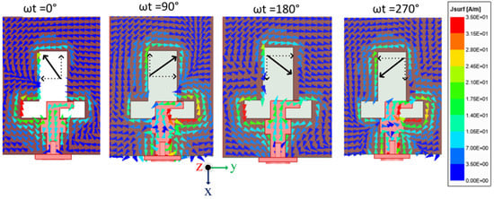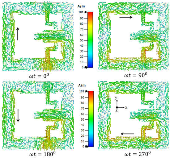 The circular polarization mechanism can be explained by using the current distribution graph shown in Figure 21. From the figure it is seen that the current density is largely concentrated along the y-axis at time instants t = 0°. The current direction on the radiating patch and on the GP are in opposing directions at t = 90°, but the current flowing on the GP along the x-axis is maximum, and therefore the radiation occurs. With regard to time phase, the present rotation is clockwise, and the radiation is left-hand circular polarization (LHCP) in the +z direction. Furthermore, when the current is rotated in the −z direction, the current rotates anticlockwise, and the radiation received is right-hand circular polarization (RHCP). The radiation pattern is symmetrical, and the RHCP is 18 dB greater than the LHCP in the boresight direction. As a result, there is excellent cross-polarization rejection. In [72], a broadside circularly polarized T-shaped slot antenna and two end-fire CP antennas are combined to create a three-port MIMO antenna system for WLAN application (5.15–5.35 GHz). Figure 22 shows a T-shaped slot antenna with L-shaped feed line to excite the CP wave in the broadside direction. The parallel arrangement of an electric dipole and magnetic dipole with a 90° phase shift is used to create the end-fire CP antenna.