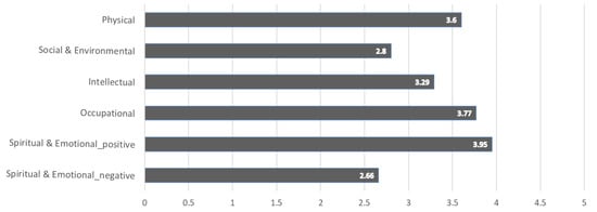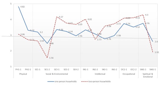 An analysis was performed of the wellness of the one-person and two-person households. We first combined two household types of perceptions of wellness to identify the average wellness scores in five dimensions, as shown in Figure 1. Positive and negative questions were both included in the Spiritual & Emotional dimension; the positive questions were about more desirable aspects and had higher scores, whereas the negative questions were about less desirable aspects and had lower scores. The score on the Spiritual & Emotional dimension was the highest, followed by the Occupational dimension with 3.77 points, and the Physical dimension with 3.60 points. Conversely, the average score on the Social & Environmental dimension was the lowest at 2.80.