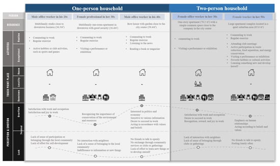 The results of the questionnaire analysis were used to develop three scenarios for one-person households and two scenarios for two-person households. The scenarios were developed according to the items that differed in the wellness characteristics of both household types, depending on gender and age. The residents’ experience was mapped through context parameters using the activities occurring in the local community centered on the place of residence, the place to visit, and the perceptions and emotions individuals feel (Figure 3). In the experience maps of five persons, the relationships were identified by mapping the places where residents interact in their homes and communities within their own lives. Mapping allows us to analyze the user experience of one or two-person households to find ways to design things that meet their expectations and needs. According to age, gender, and occupation, one-person households were set up with male office workers in their 20s, female professional workers in their 30s, and male office workers in their 40s. Two-person households were developed with female office workers in their 30s and female teachers in their 50s. Scenarios have been developed in which they live in different dwellings and different housing types. For example, a male office worker in his 20s lived in a multi-family one-room apartment of 36.3 m2 near the downtown office. The experience map consists of the experiences of residents around three major components. First, the activities experienced by residents were classified into routine daily life and special activities, and the types of activities that would occur were mainly predicted. Second, as a touch point location in a residential area, by area, it was mapped by focusing on the places where residents interact in house, locality, and downtown. Finally, it concerns the perceptions and emotions of residents; this contributed to insights into what customers think and feel when proceeding along the timeline.