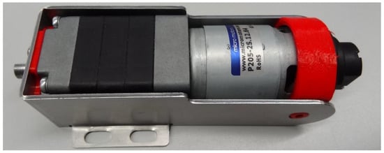 Figure 2 shows one of the three main driving motors used in the APR-02 omnidirectional mobile robot. This BDCM is the model P205-2S.12.64 (145.5 mm), manufactured by Micro Motors SRL (Verderio, Italy). This model is an industrial 12 VDC motor that includes on one side a gearbox with a ratio of 64:1 capable of delivering up to 6 Nm on the output shaft (diameter of 10 mm) and on the other side a low-cost magnetic quadrature encoder attached directly to the motor shaft.